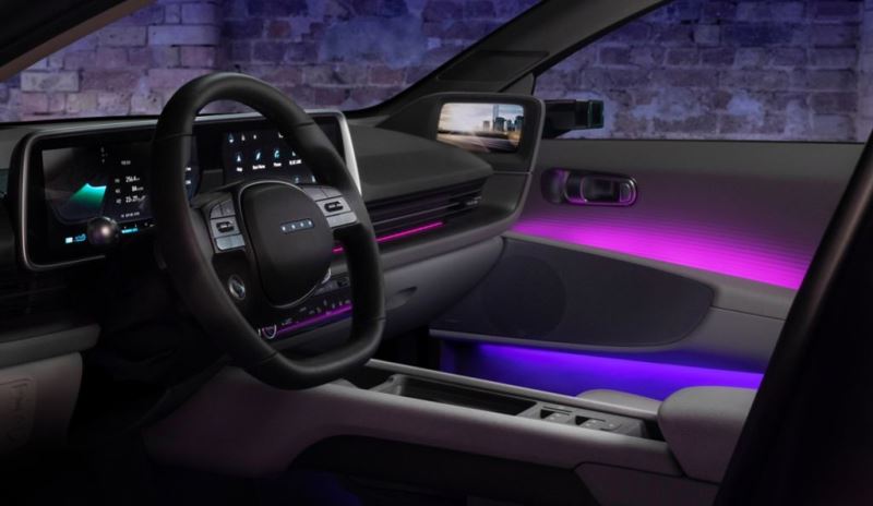 Untuk kelengkapan pula, antara yang boleh dilihat di sini adalah skrin berkembar di atas papan pemuka, panel kawalan sistem pendingin hawa dan sistem pencahayaan ambien pada panel pintu. Stereng tiga spoke itu diinspirasikan oleh stereng yang digunakan pada model asal.