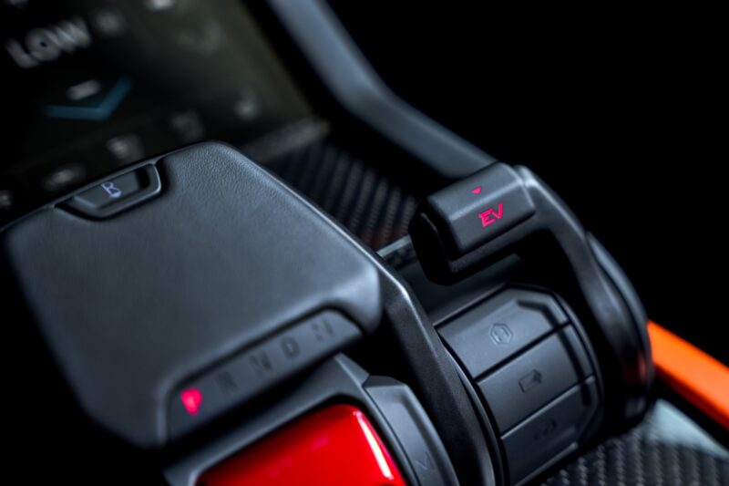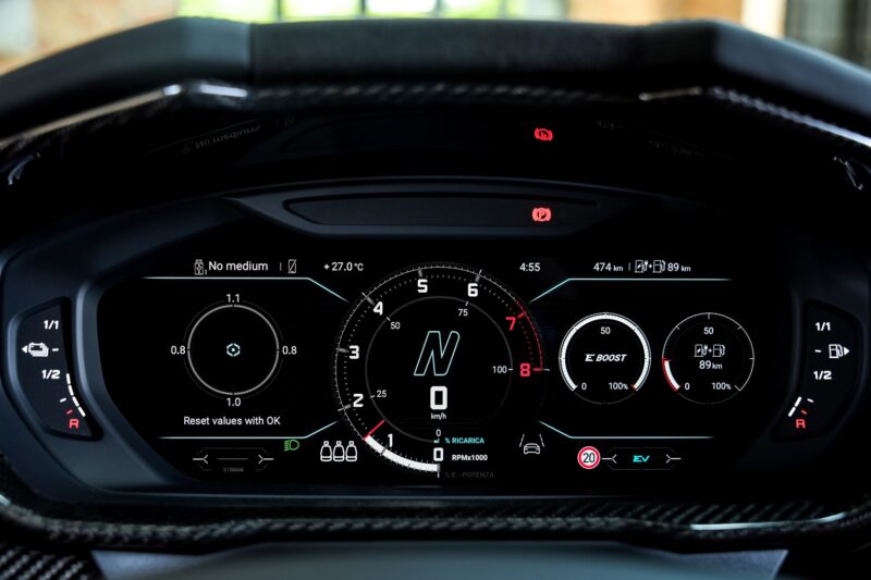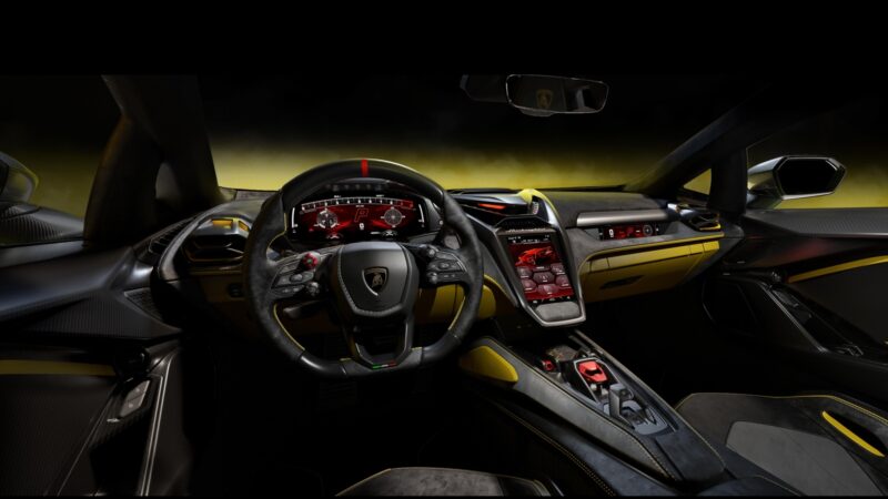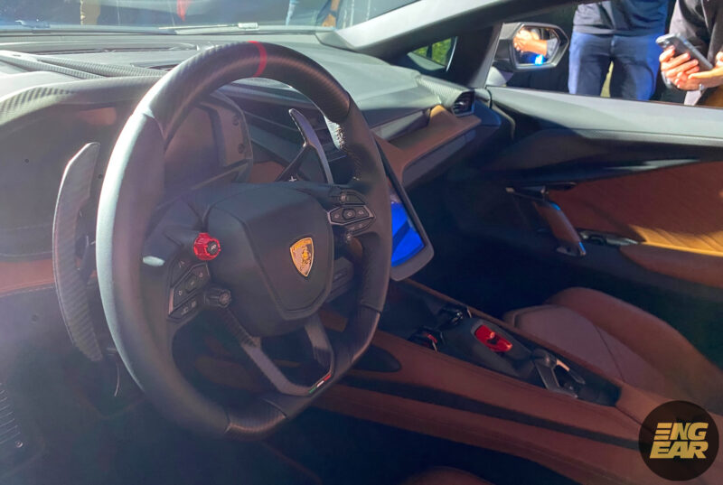 Untuk bahagian kabin, Lamborghini Revuelto dilengkapi paparan instrumen digital 12.3-inci, dan paparan instrumen potret bersaiz 8.4-inci di tengah.
