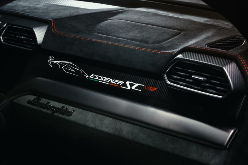 Ruang dalaman pula dihiasi dengan upholsteri Alcantara berwarna hitam Nero Cosmus, trim kulit, gentian karbon dengan kemasan berkilat atau matte, elemen aluminium dan Dark Package. Papan pemuka pada bahagian penumpang menampilkan logo Essenza SCV12.