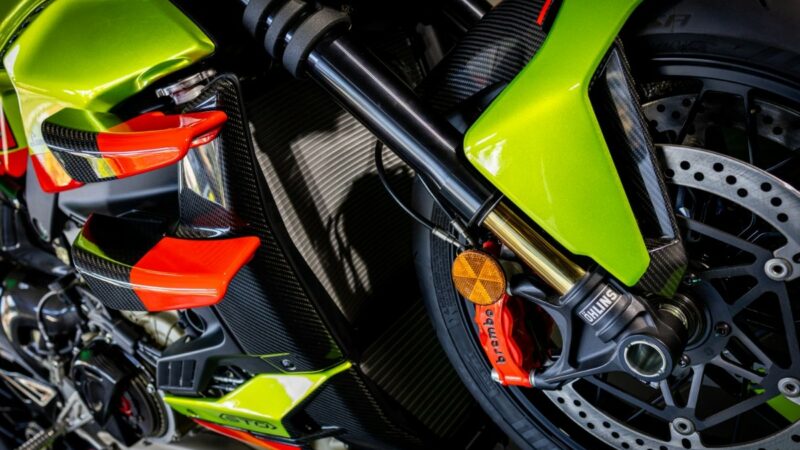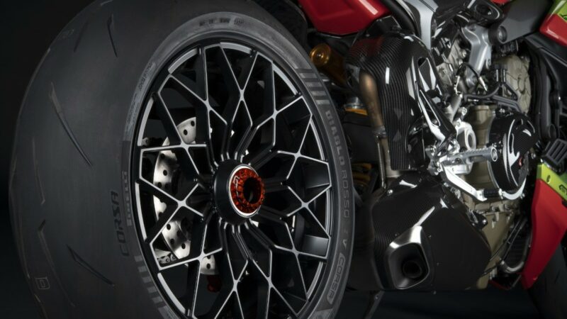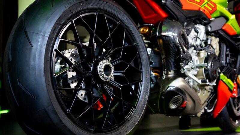 Jika anda lihat pada warna dan liverynya, anda akan tahu Streetfighter V4 Lamborghini diinspirasikan dari Lamborghini Huracan STO (Super Trofeo Omologata). Rimnya tampil kemas dan aerodinamik, ditambah dengan nut pengunci titanium pada rim belakang.