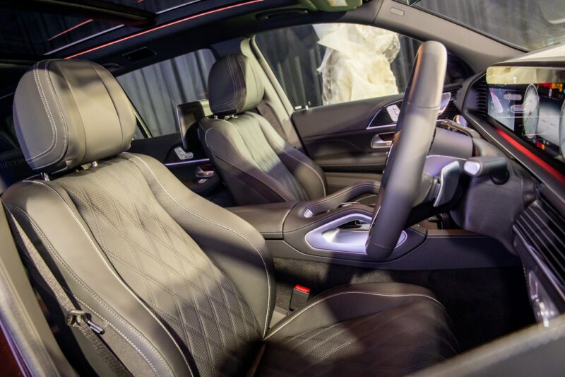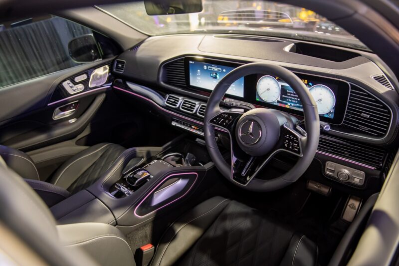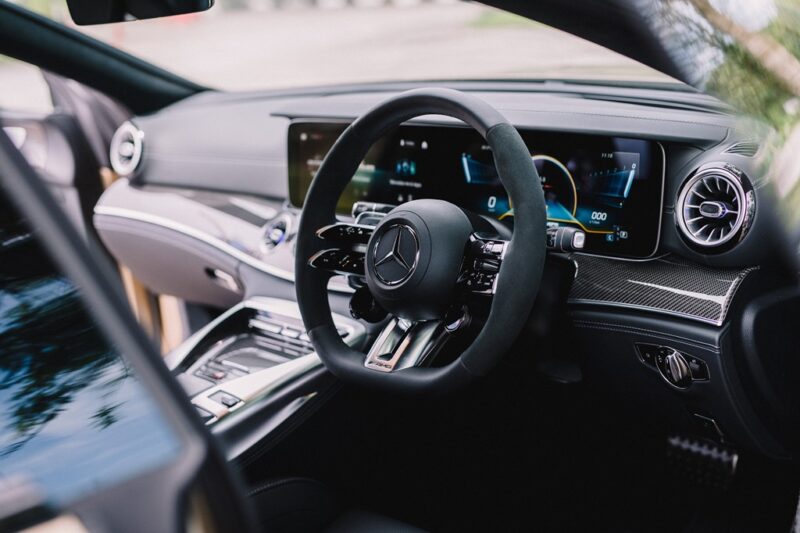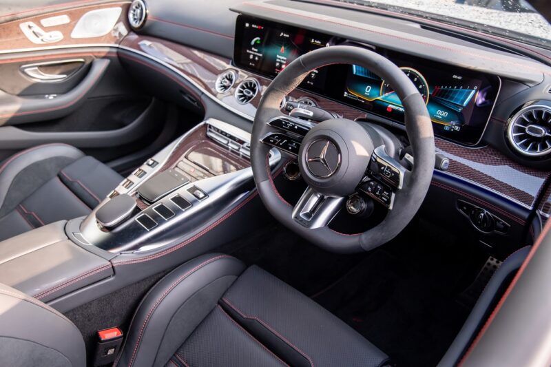 Di dalam, terdapat stereng AMG yang dibalut kulit Nappa, trim kayu Anthracite, panel pintu AMG, karpet AMG, bumbung panoramik dan sistem pencahayaan ambien.