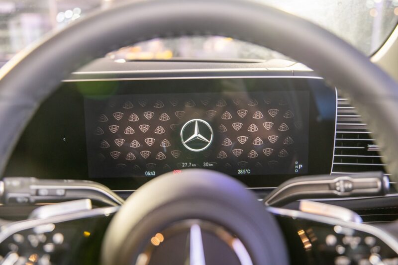 Di dalam, terdapat sistem infohibur MBUX generasi terkini yang menampilkan skrin OLED condong dengan Apple CarPlay/Android Auto dan kluster instrumen digital, namun tidak mendapat papan pemuka digital Hyperscreen seperti EQS.