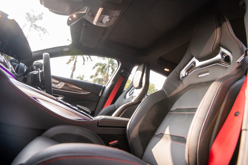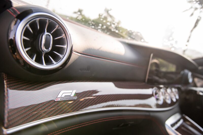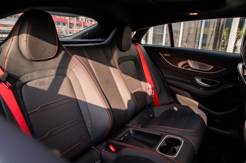 Tema hitam dan merah diteruskan pada bahagian dalaman menerusi upholsteri kulit Nappa berwarna hitam yang membaluti kerusi AMG Performance, serta jahitan, tali pinggang keledar dan trim gentian karbon berwarna merah.