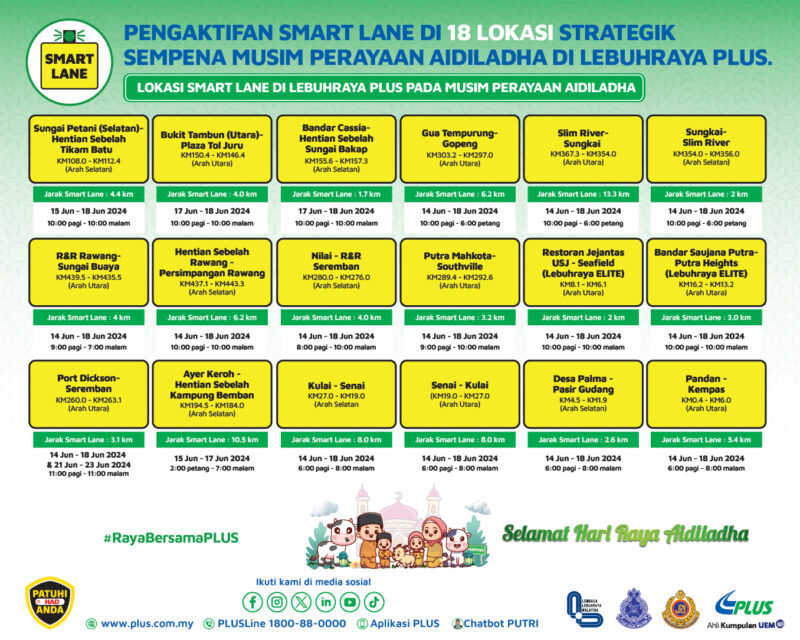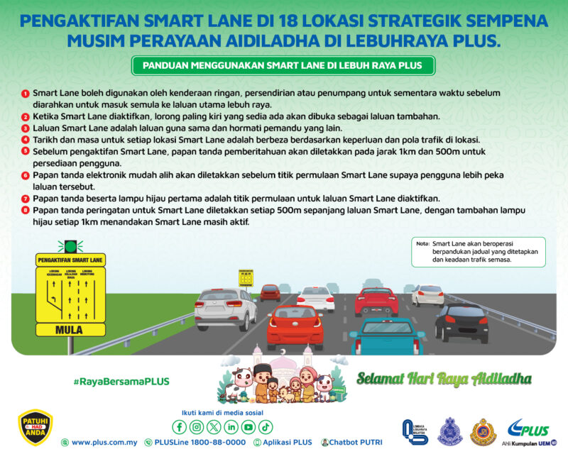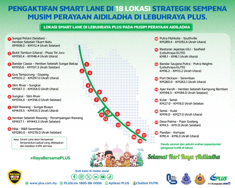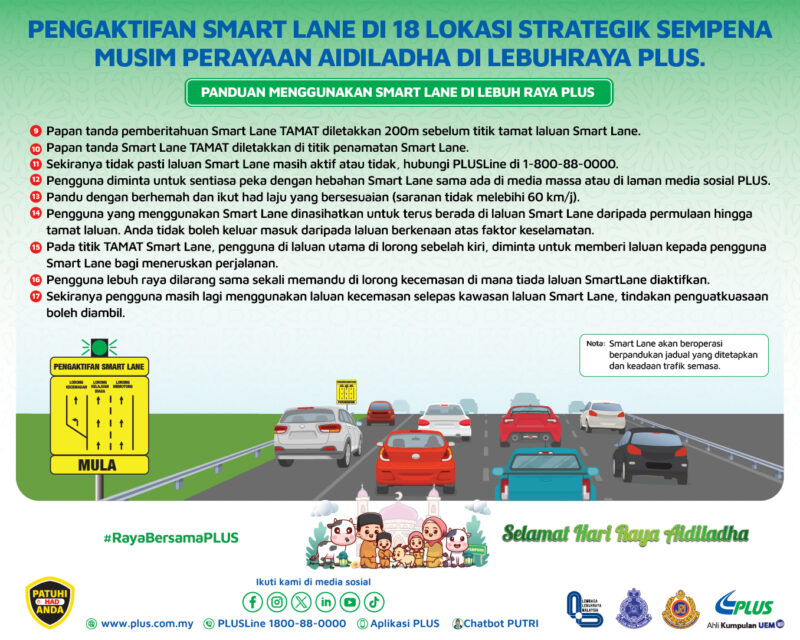 Bagi memastikan pergerakan trafik lancar semasa cuti perayaan Aidiladha yang akan datang, PLUS Malaysia Berhad akan mengaktifkan laluan Smart Lane di 18 lokasi tumpuan trafik di lebuh raya di bawah kendaliannya.