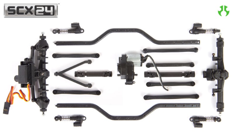 Casis SCX24 menampilkan konfigurasi pacuan empat roda (4WD) sepenuh masa dengan suspensi tiga-link di depan dan empat-link di belakang dan solid axle untuk kedua-dua gandar sama seperti kenderaan sebenar.