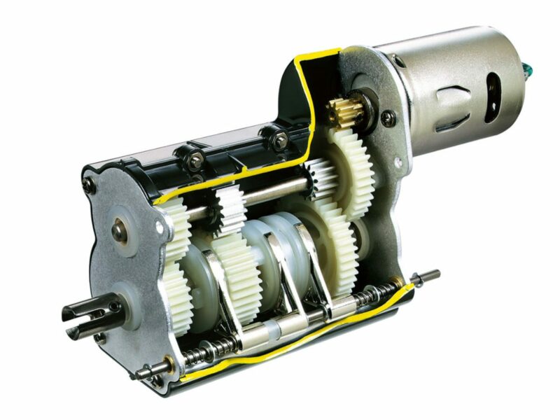 Casis TT-02 Tamiya menggunakan susun atur menegak dengan pek bateri di kiri, dan motor serta elektronik di bahagian kanan.