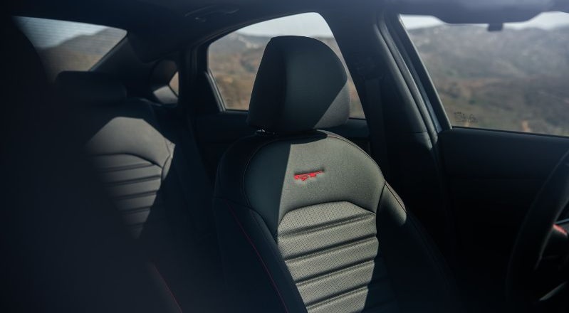 Jahitan merah pada tempat duduk, pintu, stereng dan karpet