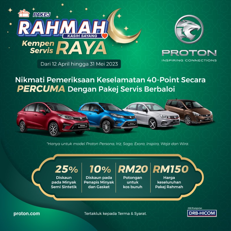 “Kempen inklusif ini memastikan kos dikongsi secara sama rata antara Proton Edar dan pengedar kami sebagai sebahagian daripada aktiviti Tanggungjawab Sosial Korporat (CSR) kami dan kami berharap dengan kempen ini, pemilik digalakkan servis kereta mereka di pusat servis yang bertauliah sebelum memulakan perjalanan balik kampung semasa tempoh perayaan.”