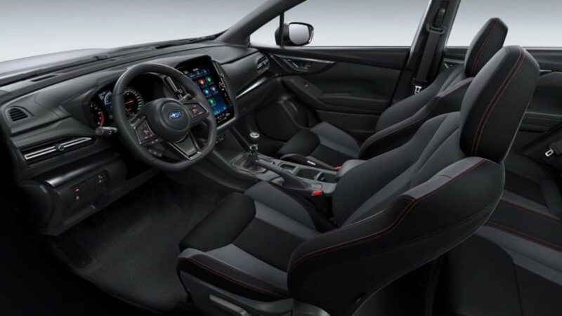 Bahagian dalam pula dihiasi upholsteri fabrik hitam dengan jahitan merah, pemegang pintu hitam, dan logo-logo STI.