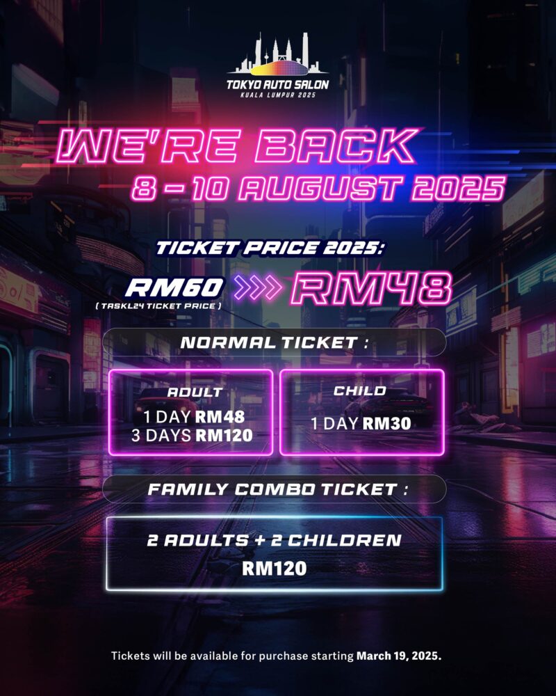 Ini kerana tiket kemasukan untuk Tokyo Auto Salon Kuala Lumpur 2025 (TASKL 2025) sudah mula dijual sejak semalam (19 Mac) dengan harga yang lebih berpatutan.