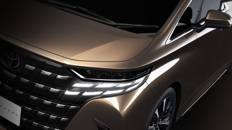 Alphard (unit berwarna putih) meneruskan tema gril besar seperti model sedia ada, namun pada hemat penulis, ia kelihatan lebih lebar. Lampunya pula telah direka semula menjadi lebih nipis dan tajam, manakala tersembunyi di bawahnya adalah kluster lampu nyalaan siang ala Hyundai Tucson.