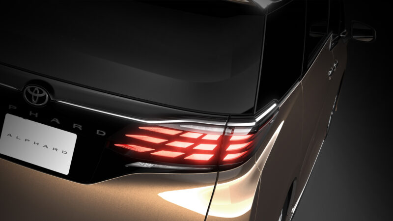 Bahagian belakang juga telah direka semula. Perubahan terbesar di sini adalah tulisan ‘ALPHARD’ berlatarbelakangkan trim hitam pada bahagian tengah tailgate. Lampu masih lagi dalam bentuk melintang, namun ia dihiasi dengan grafik yang lebih menarik serta jalur-jalur krom.